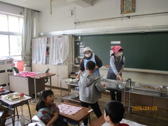 配膳は、今週いっぱい大人が担当し、来週からこどもたちが白衣を着て、マスクを着けて配膳を行います。今日は、給食をもらいに行くだけでしたが、待っている間も本当に行儀よくしている1年生の態度は立派でした。きょうの給食メニューは、