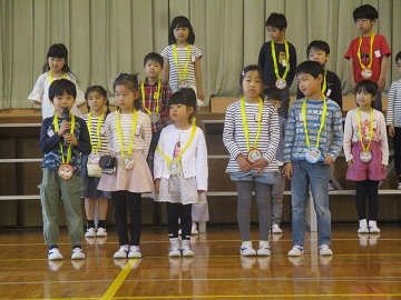今日は、全校児童が校庭に集合し、体育朝会を行いました。