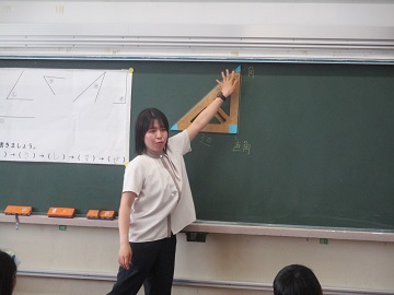 3年生の時に学習した辺や頂点、角度などについて復習した後、角度について学習しました。