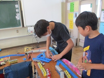 今日は、プラレールで自分たちの思い描いたコースをつくりました。