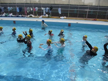 4年生は、いつもと違い、水着の上に服を着てプールに入りました。