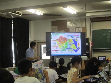 区の防災ハザードマップを基に、風水害について自分たちの住んでいる地域について確認しました。