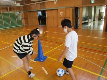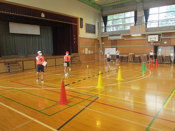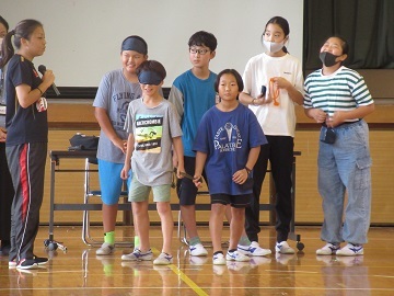シュート練習では、チームで声をかけあってアイマスクをしながらも目標のコーンに当てることができました。