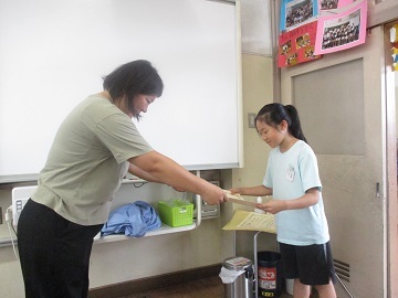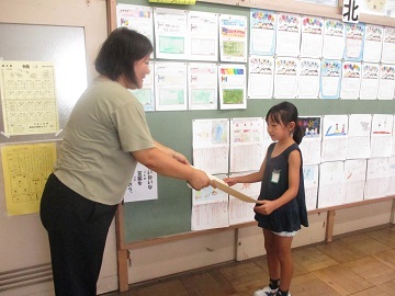 各教室で図工の先生から受賞した児童へ賞状が手渡されました。