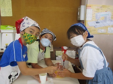 子どもたちは、色やにおいで、酢やハンドソープ、消毒液など見分けていました。