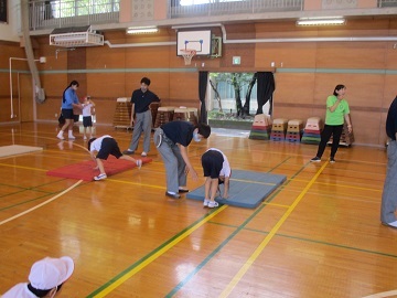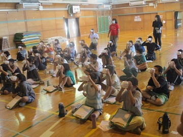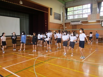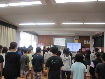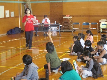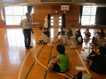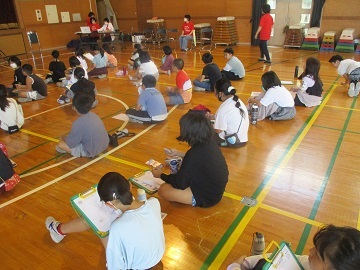 3校時に1から3年生、4校時に4から6年生が体育館に集まり、行いました。
