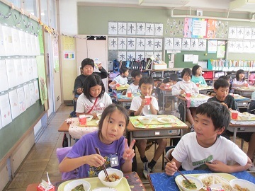 萩中小学校の子どもたちは、給食をたくさん食べます。今日もみんなで楽しく給食を食べていました。