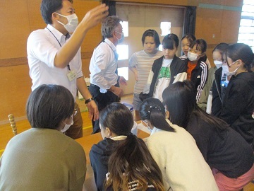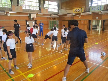 2人1組になってアイマスクをしている人に言葉でどのように動きを説明するか、アイマスクをしている人にドリブルする方向をどのように伝えたら良いかなどを教えていただきました。