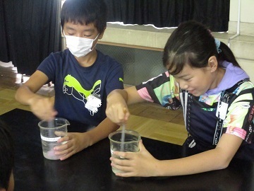 生活用水等の汚れた水をどのようにきれいにしていくかということで、沈殿実験を行いました。
