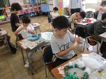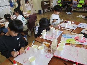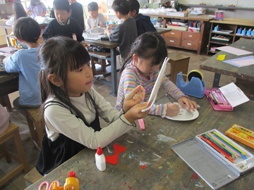 1年生が、生活科の授業で秋のおもちゃ作りをしました。
