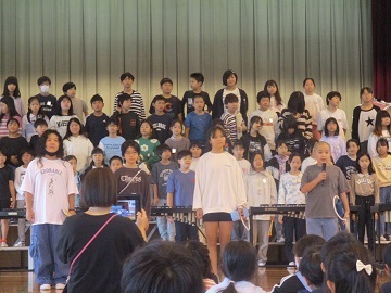 近隣のつばさ総合高校、出雲中学校、都南小学校、中萩中小学校の児童・生徒が萩中小学校の体育館に集まり、音楽交流会が行われました。