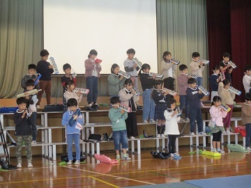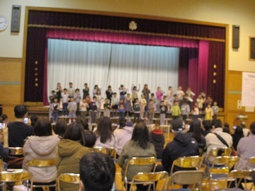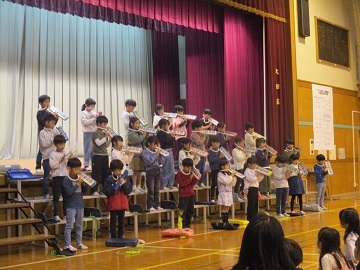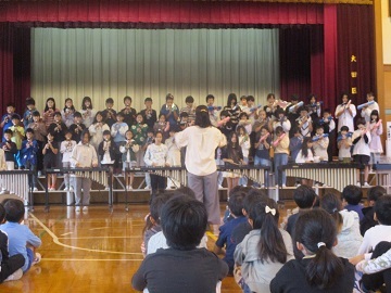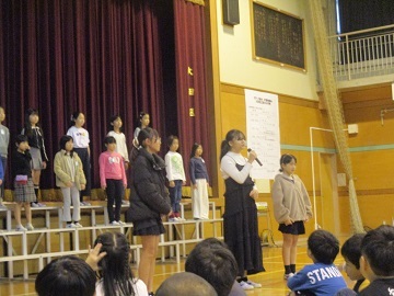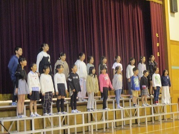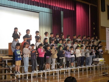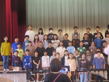 本番のアプリコでの様子は写真撮影できないので、前日に全校児童の前で披露した合唱と合奏の様子の写真を掲載します。