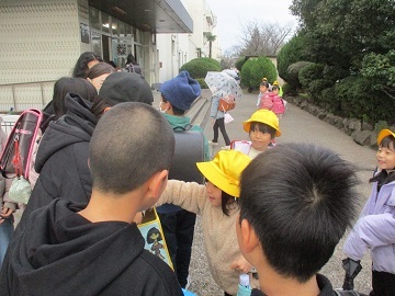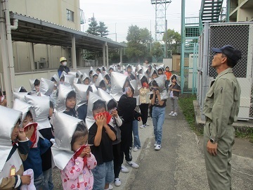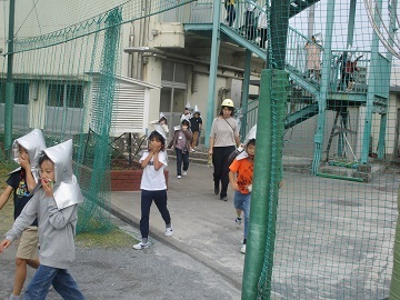 児童は放送をよく聞き、防災頭巾をかぶり、ハンカチでしっかりと鼻と口を押えて避難してきました。