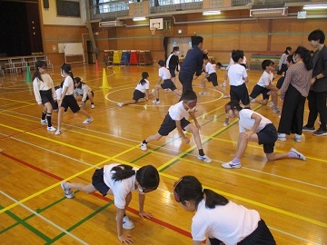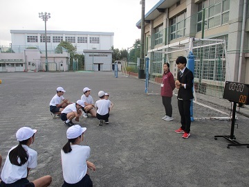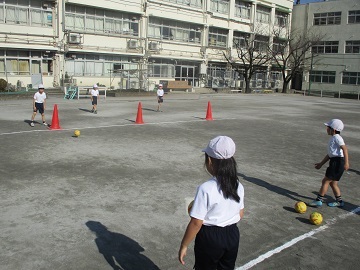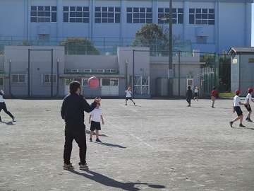 校庭からこどもたちの楽しそうな声が聞こえていて、見てみると1年生が体育をしていました。