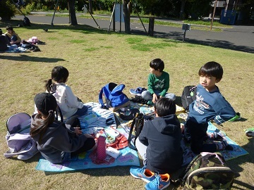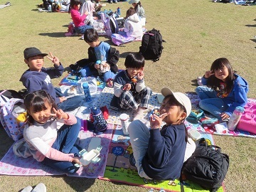 お昼は、水族館近くの公園で食べました。1年生にとっては、小学校に入学してから友達と食べる初めてのお弁当で、とてもおいしそうに食べていました。