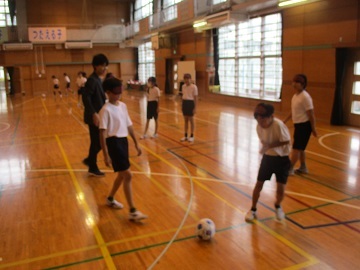 アイマスクをしてのドリブルでは、足音や手を叩いて友達を誘導するなど、工夫も見られました。