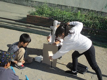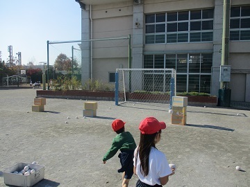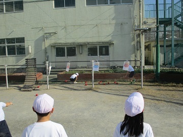 見に行くと、玉入れの玉を段ボールや鬼がかかれている紙をめがけて投げているグループや、コーンにボールを蹴ってあてたり、バスケットゴールにボールをシュートしているグループがいました。