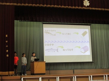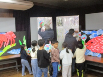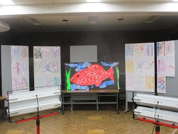 そこに2年生が自分たちでかいた魚を貼った団扇をもって登場し、自分たちの絵に団扇を入れていきました。
