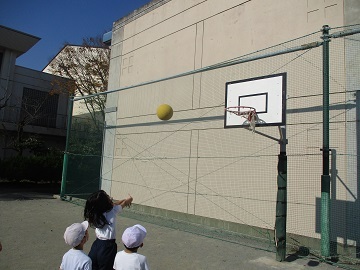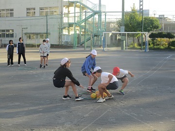 鉄棒前、バスケットゴール前など、4か所に分かれてゲームのようなことをしていました。