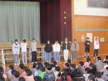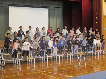 全校朝会の中で、今週土曜日に行われる大田区小学生駅伝大会の壮行会が行われました。