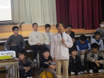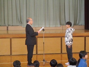 その後は、まず土曜日の小学生駅伝大会の表彰で頑張った5、6年生の選手が紹介され、代表で駅伝部長の6年生が校長先生から表彰されました。