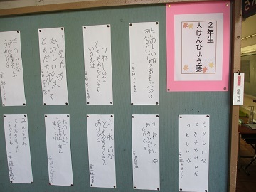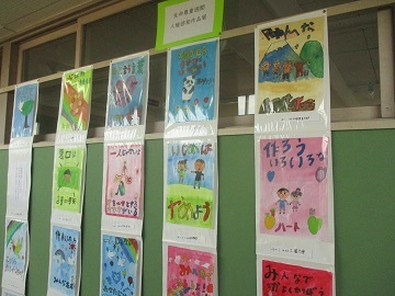 人権標語や、人権ポスター、人権習字など、各学年の作品が掲示されています。