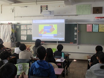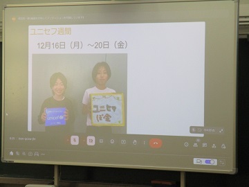 今回は、オンラインで代表委員会室から代表委員の児童がユニセフについて紹介しました。