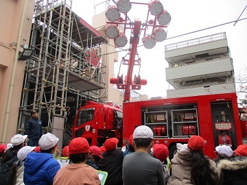 ポンプ車や照明車を近くで見て、照明車が高くから明るく照らす様子を見て「すごい」という声が聞かれました。