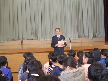 今日の全校朝会では、最初に蒲田警察から警察官が来てくれ、冬休みに向けての交通安全について話をしてくれました。