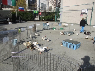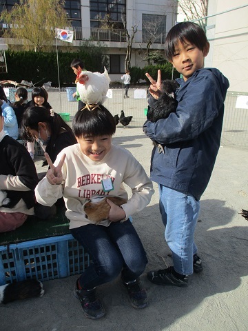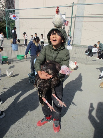 校庭にヒヨコやハツカネズミの小さな動物から、アヒルや七面鳥、ヤギや羊、ポニーまで様々な動物がきました。