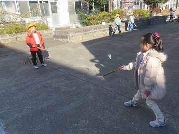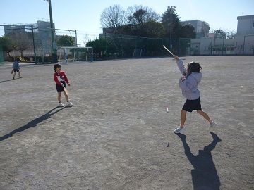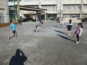 1年生が校庭で羽根つきをして遊んでいました。