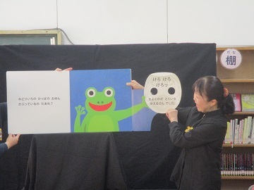 今日は、1、2年生を対象に鬼や冬至についての本などをこどもたちが興味をもつように楽しく紹介してくれました。
