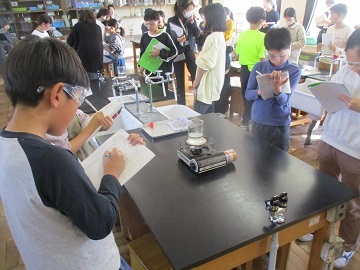 4年生は、ビーカーに入っている水の様子をじっくり観察し、ビーカーがくもってきたことや水に泡が出てきていること、火を消した後に水が減っていることなど、気が付いたことを発表していました。