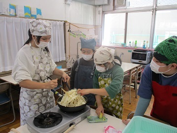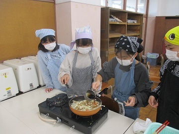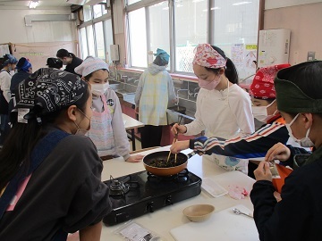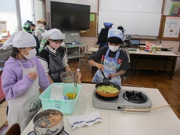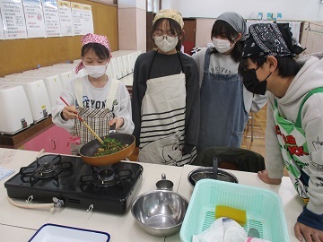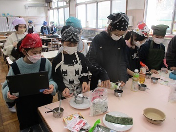 各班で、海苔や昆布、シラス、きゅうりなどの材料を煮詰め、そこに鰹節やゴマなどを加える班もあり、家庭科室にはとても食欲をそそる香りが漂っていました。