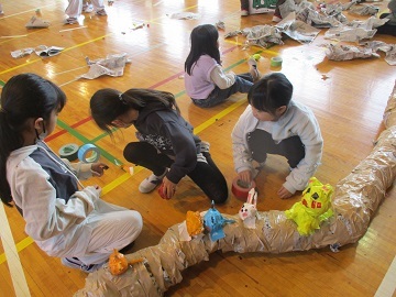 体育館に2、4、6年の3学年が集まり、体育館に2本の長いロープに新聞紙をガムテープを使って固定しました。