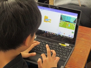 中には、応用して、キャラクターと岩やサッカーなどのゲームを作成している児童もいました。