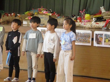 今日の全校朝会では、池上会館に出展された児童の表彰が行われました。