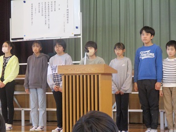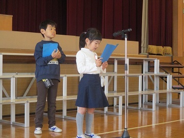 児童代表の言葉では、4年生の代表児童が2学期に頑張ったことや3学期に頑張りたいことを発表しました。