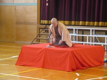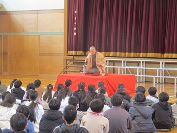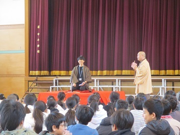 体育館に高座を作り、柳家福太楼師匠を講師として迎えました。