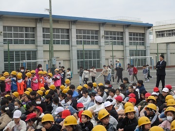 こどもたちは、放送をよく聞き、ヘルメットをかぶり、しっかりとハンカチで口を覆い、静かに避難しました。