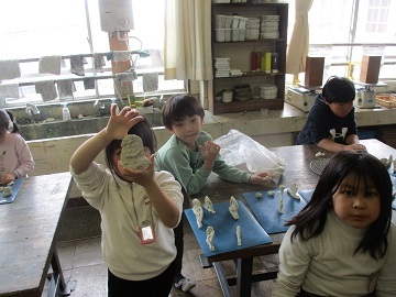 できた人が、みんなの前で形を出すために図工室のいろいろな部分に粘土を押し当てて作ったと、工夫した部分を発表しました。