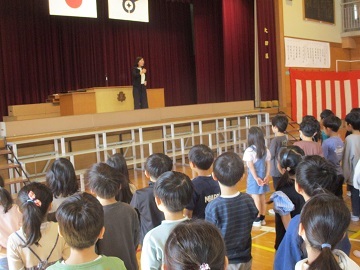 今日は朝の時間に臨時の全校朝会を行い、お別れの会を行いました。