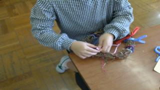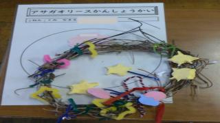 どんぐりや粘土を使って、あさがおのつるでリースを作りました。