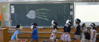 国語科の「くじらぐも」の学習では、くじらぐもに乗って空の旅をする子ども達の会話を想像しました。児童は作品の中の子ども達になりきり、様々な楽しい会話を考えました。とても楽しい空の旅になりました。