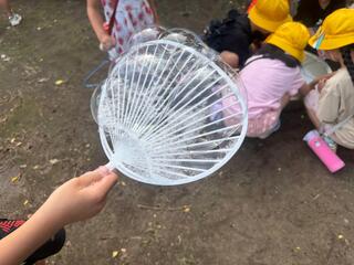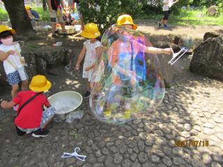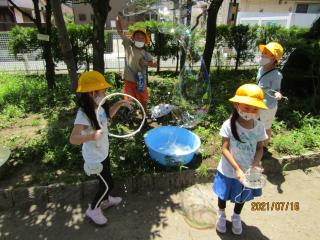 自分たちでシャボン玉液を作り、ハンガーやうちわ、段ボール、筒、ペットボトル、ホイッパーなど色々な道具を用いて、大小様々なシャボン玉を楽しみました。