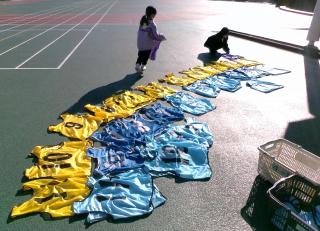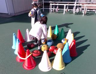 体育倉庫にあるものも、友達と協力しながら並べました。