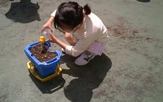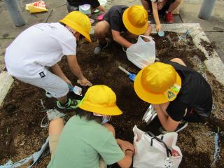 ゴールデンウィークが終わったタイミングで、生活科の学習としてアサガオの種まきをしました。「押し花にしたいです。」「たたきだしで、もようづくりもしたいです。」「葉っぱで工作ができそうです。」「色水遊びもできるよ。」と、これまでの経験を話し合いました。毎朝、学校に来たら、アサガオの様子を見て、水やりをしています。