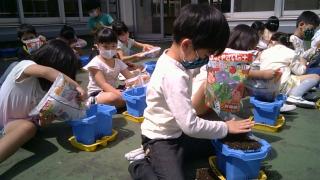 植木鉢に、土を入れるだけでも1年生には大仕事です。ふかふかの土が気持ちよかったそうです。