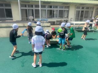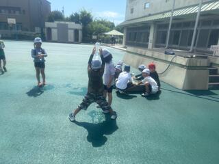 生活科の「なつのあそびをたのしもう」の学習で水遊びをしました。ペットボトルの水で地面に絵をかいたり、頭から水をかぶって涼んだりしました。「またやりたい」「もっとあそびたい」という声がたくさんあがりました。