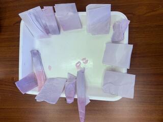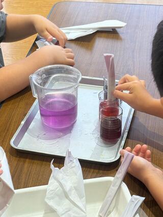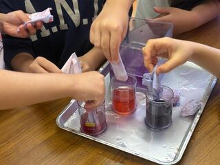 色水遊び。アサガオの色水に、お掃除クエン酸や炭酸ソーダを入れると、色が変わります。折り染めを楽しみま